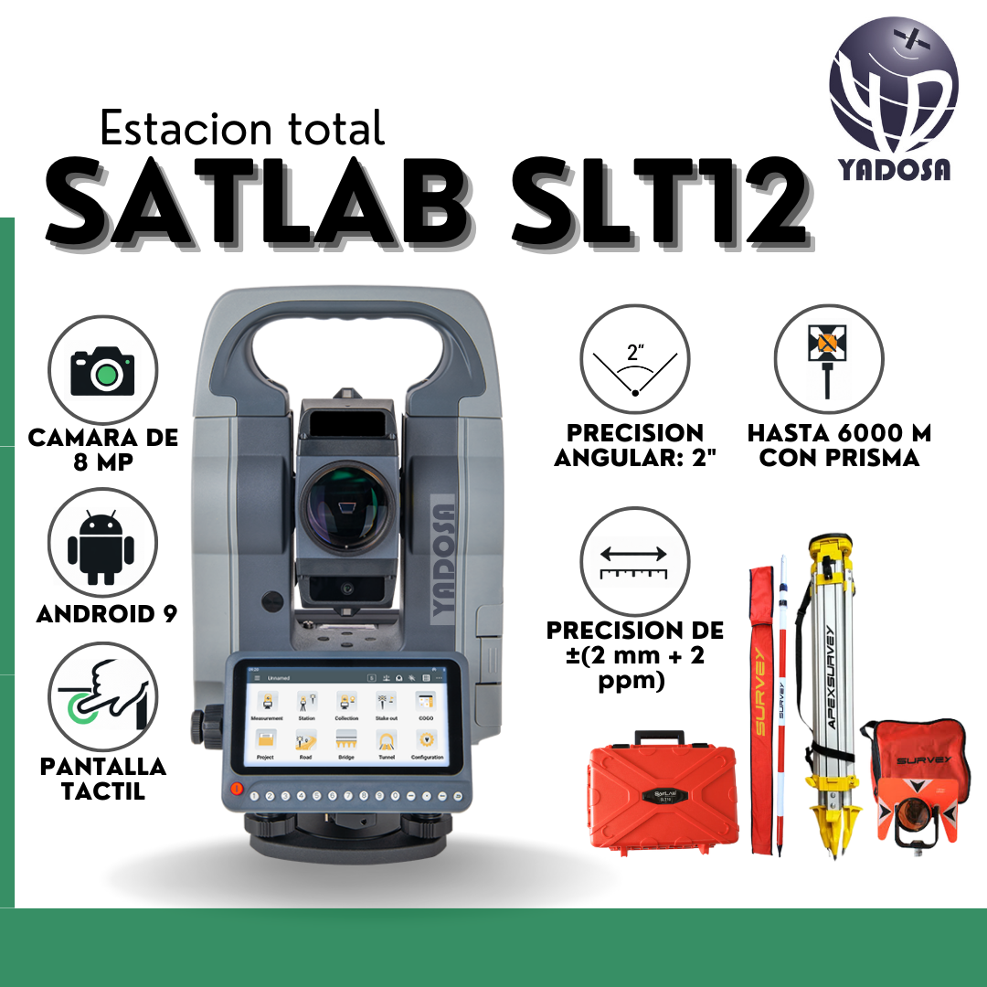 La SLT12 cuenta con dos pantallas de alta definición y una cámara integrada de 8 megapíxeles, permitiendo replanteo en realidad aumentada. La duración de la batería puede alcanzar hasta 10 horas de uso continuo. Posee una pantalla táctil de 5,5” con resolución 720×1440, medición EDM sin prisma hasta 1000 metros con velocidad de 0.3 segundos y con prisma de hasta 6000 m, conectividad Bluetooth, Wi-Fi y punto de acceso Wi-Fi, procesador Qualcomm Octa-core 1.8 GHz y puerto Tipo-C con función USB OTG. Su software especializado permite realizar funciones de replanteo, desplazamiento, medición múltiple (MLM), medición remota (REM) y repetición de puntos. Entre sus ventajas destacan la precisión y eficiencia en tareas de campo, fácil manejo mediante pantalla táctil y Android, optimización del tiempo y flujo de trabajo.